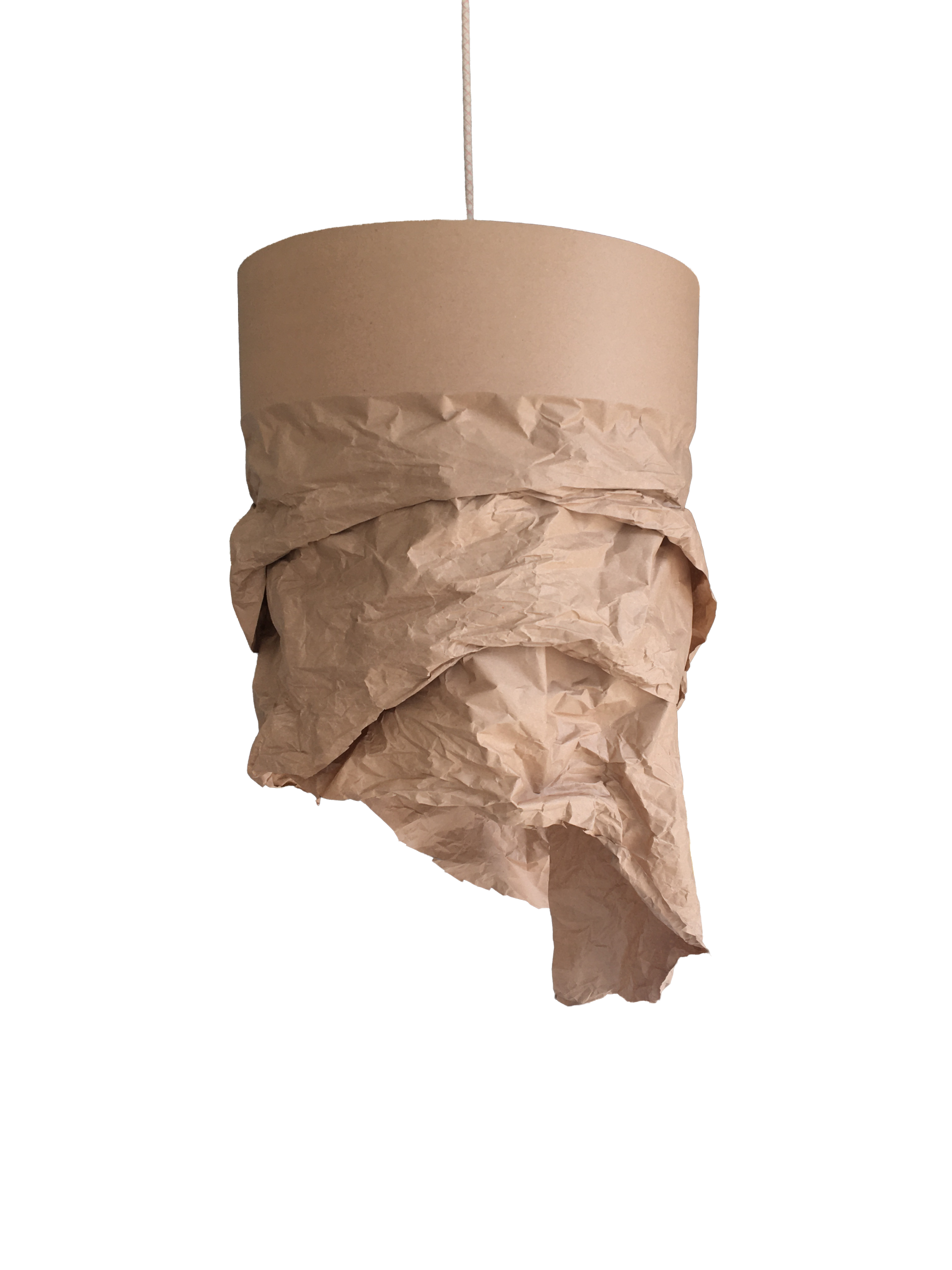 Le kraft, brut et sincère, devient ici territoire d’expression. Les plis captent la lumière, sculptent l’ombre, et donnent à la suspension une vibration presque organique.